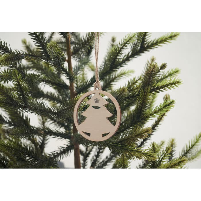 Houten boomvormige decoratiehanger met jute koord inclusief sparrenzaadjes. Gepresenteerd in gedecoreerde kraft envelop. Gemaakt in de EU.