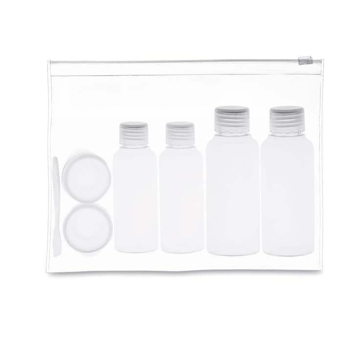 Vliegtuig reissetje. Transparant tasje voor in uw handbagage met vier lege flesjes en 2 lege potjes. (100ml, 50ml and 10ml)