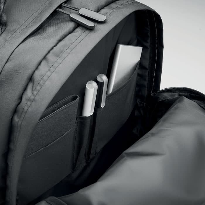 15 inch laptop rugzak van 300D RPET polyester. Met 2 grote vakken met rits, dubbele voorvakken met rits en zijvak van gaas. Gewatteerde rug- en schouderbanden.