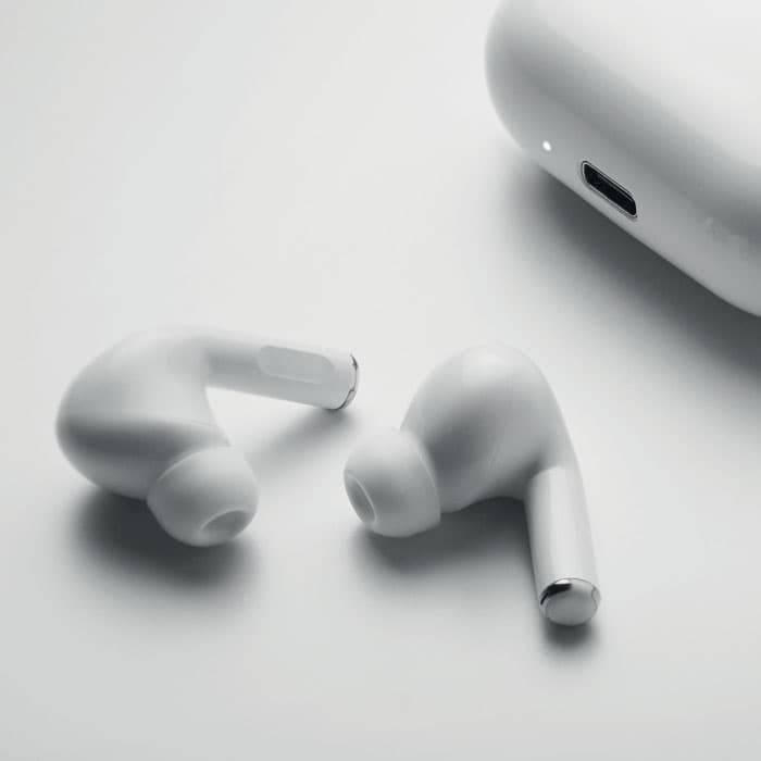 ABS True Wireless Stereo (TWS) 5.3 draadloze stereo-oordopjes met microfoon en 30 mAh ingebouwde batterij. Type-C ingang. Speeltijd +/- 3 uur. Inclusief een 180 mAh laadstation.