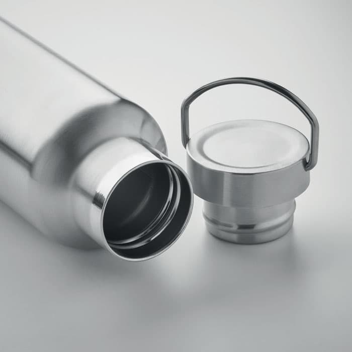 Dubbelwandige isolerende vacuümfles van gerecycled roestvrij staal (90% gerecycled RVS en 10% RVS) en dop voorzien van handvat. Inhoud: 500 ml.