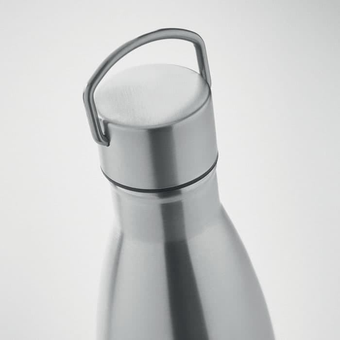Dubbelwandige geïsoleerde vacuüm fles van roestvrij staal (90% gerecycled RVS en 10% RVS) met dop voorzien van handvat. Lekvrij. Inhoud: 500 ml.