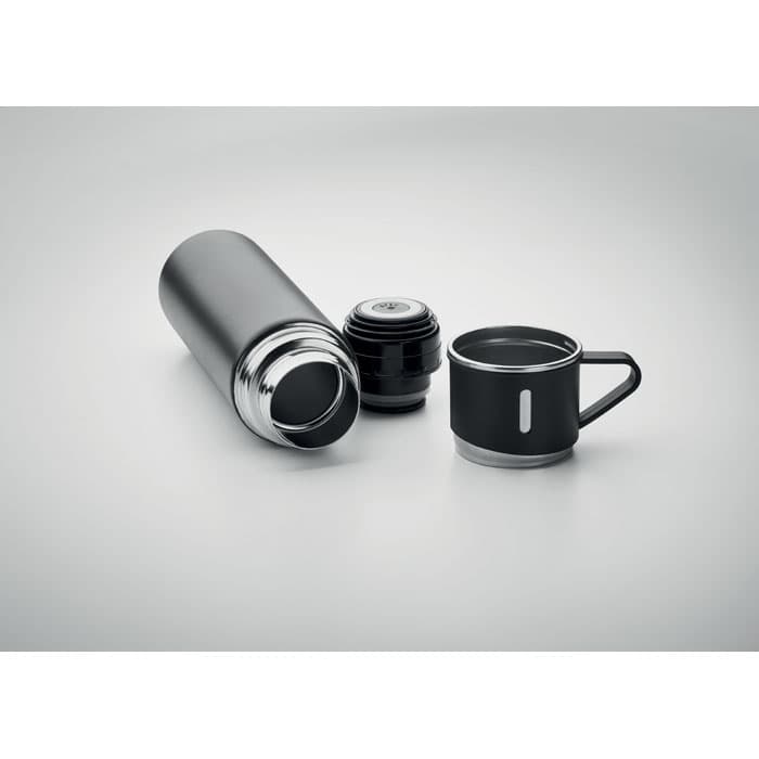 Dubbelwandige roestvrijstalen vacuümgeïsoleerde thermosfles met lekvrije deksel . Capaciteit: fles 420 ml, beker 150 ml.