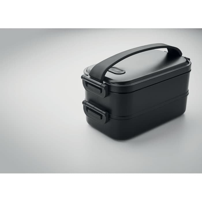 PP lunchbox met twee compartimenten, verwijderbare verdeler met zijgespen en luchtdicht deksel. Capaciteit: 850 ml (2x).