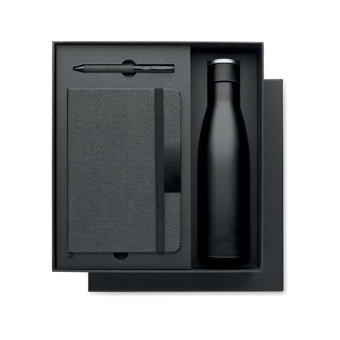 Luxe 3-delige geschenkset. Inclusief een A5 notitieboekje met harde RPET kaft. Ingebonden. 160 pagina's gelinieerd gerecycled papier (80 vellen). Bijpassende elastische sluitband en lint met paginamarkering en penhouder. Bijpassende balpen. Dubbelwandige roestvrijstalen vacuümgeïsoleerde fles. Inhoud: 500 ml. Gepresenteerd in luxe geschenkverpakking. FSC®-certified | FSC MIX CREDIT, P7.1, FSC-C213206