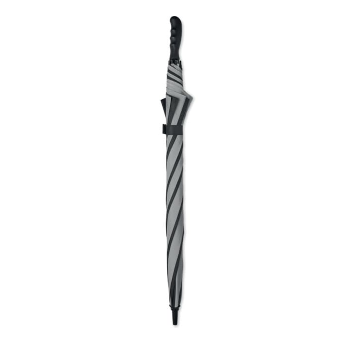 30 inch handmatig openklapbare windbestendige paraplu van 190T (4 panelen) en reflecterend materiaal (4 panelen). Frame, baleinen en steel van glasvezel. Rechte ABS-handgreep met rubberen afwerking. Handmatige sluiting.