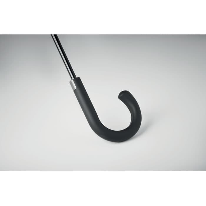 23 inch automatisch openende windbestendige paraplu in 190T pongee met geruit binnenpatroon. Fiberglas frame met zwart afgewerkte schacht en kunststof uiteinden. Gebogen handgreep met rubberen afwerking. Handmatige sluiting.