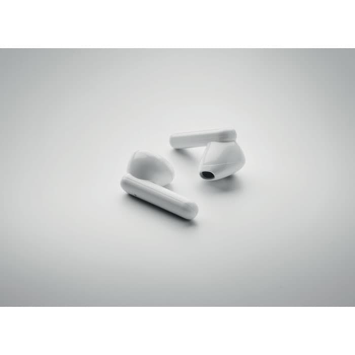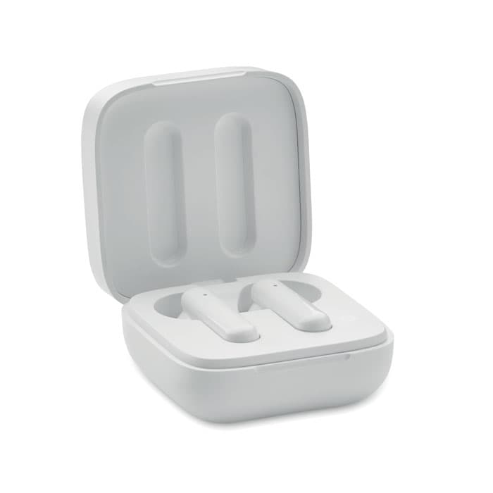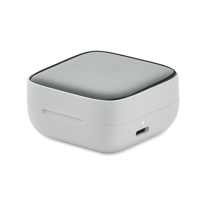 ABS True Wireless Stereo (TWS) 5.3 draadloze oordopjes met microfoon en een 30 mAh batterij. Speeltijd ca. 4 uur. Oplaadbare batterij op zonne-energie. Automatisch koppelen. Inclusief een Type C oplaadkabel en een 200 mAh laadstation.