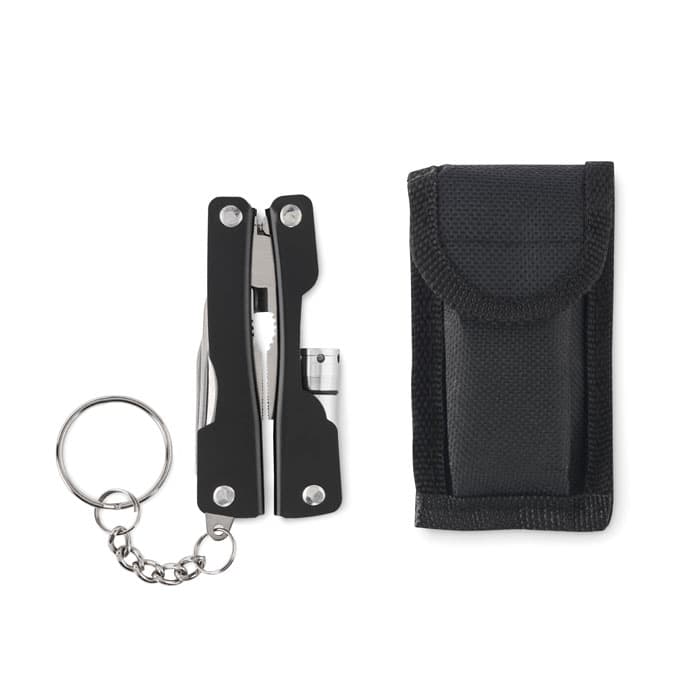 Opvouwbaar multifunctioneel zakmes met zaklamp van roestvrij staal. Inclusief 10 gereedschapsfuncties en een pouch van 600D polyester. Inclusief 3 x AG3 knoopcelbatterijen.