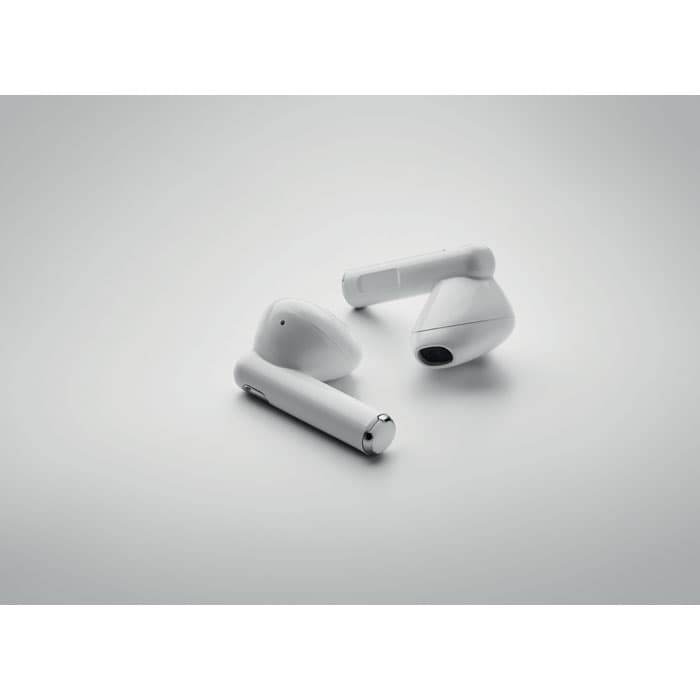 ABS True Wireless Stereo (TWS) 5.3 draadloze stereo-oortelefoon met microfoon en 30 mAh build-ion batterij en 200 mAh oplaaddoos. Speeltijd ongeveer 4 uur. Automatisch koppelen mogelijk.