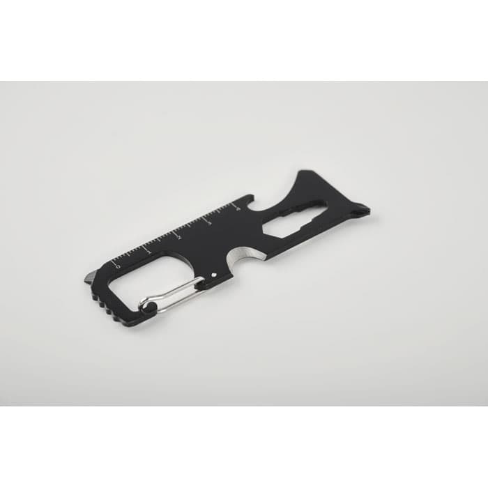 Roestvrijstalen multitool voor zakkaarten. 8 functies. Inclusief: tandzaag, draadknipper, moersleutel, kruiskopschroevendraaier, sleufschroevendraaier, maatverdeling, flesopener en sleutelhanger.
