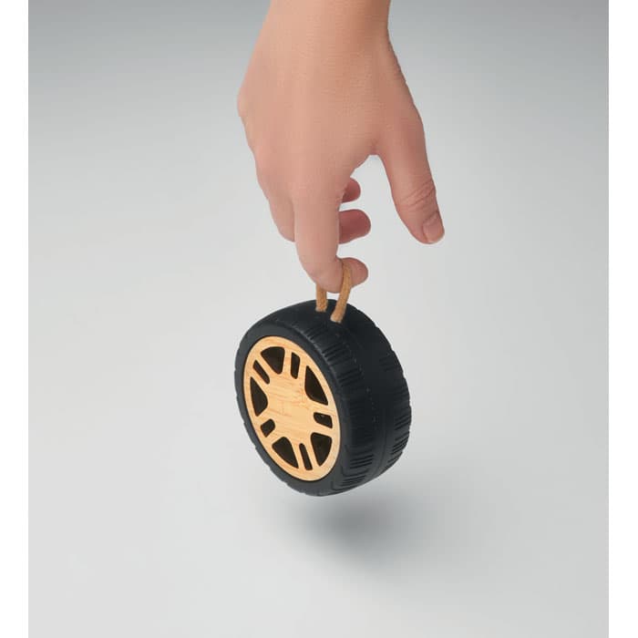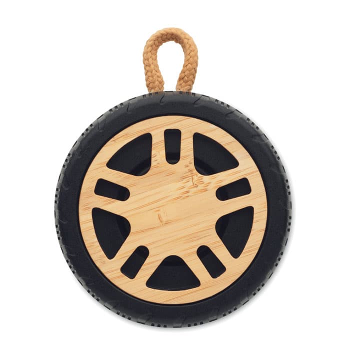 Daadloze 5,3 luidspreker in autoband vorm met 3W vermogen, gemaakt van gerecycled ABS met bamboe details en een handvat van katoen. Inclusief oplaadbare batterij van 400 mAh.