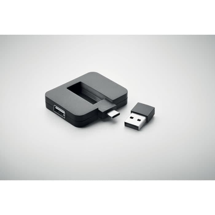 4-poorts 2.0 USB van ABS. Ingang: Type-C & Type-A. Uitgang: 2 x Type-A en 2 x Type-C.