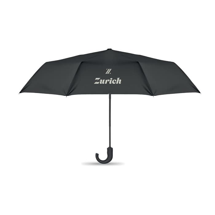 23 inch 3-voudige windbestendige auto open/close paraplu in dubbellaags 190T pongee met geruit binnenpatroon. Zwart geplastificeerd frame en schacht. Tweedelig zwart glasvezel vernikkeld middenstuk. Gebogen handvat van ABS met rubber.