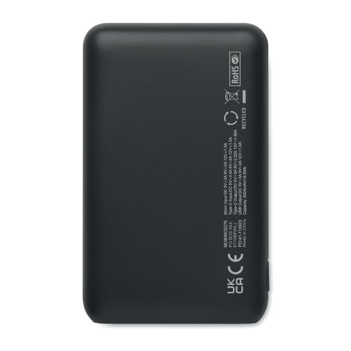 Powerbank 5000 mAh in gerecycled ABS. Geschikt voor smartphones, Uitgangsstroom DC5V/2A 2x type A en 1x type C in/uit en 1x type micro-B ingang.