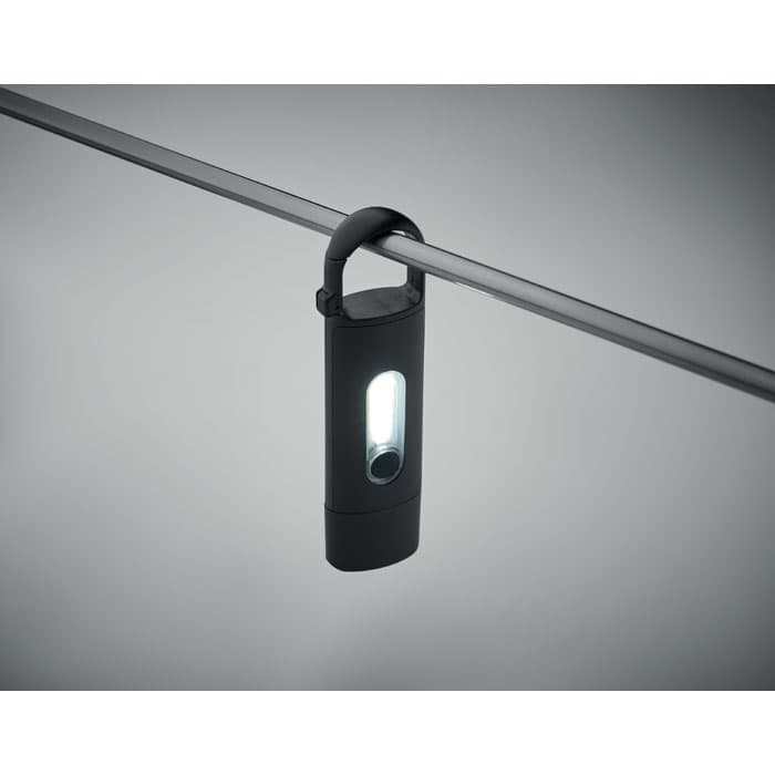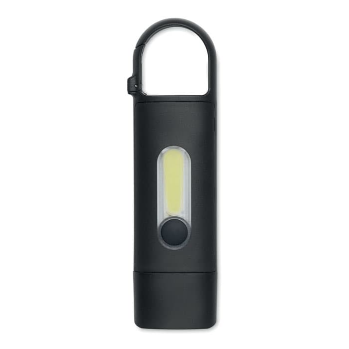 Oplaadbare COB-zaklamp op zakformaat met karabijnhaak in ABS. Met noodverlichting en 3 verschillende verlichtingsstanden. 1 x 3,7 V, 200 mAh oplaadbare lithiumbatterij (niet vervangbaar).