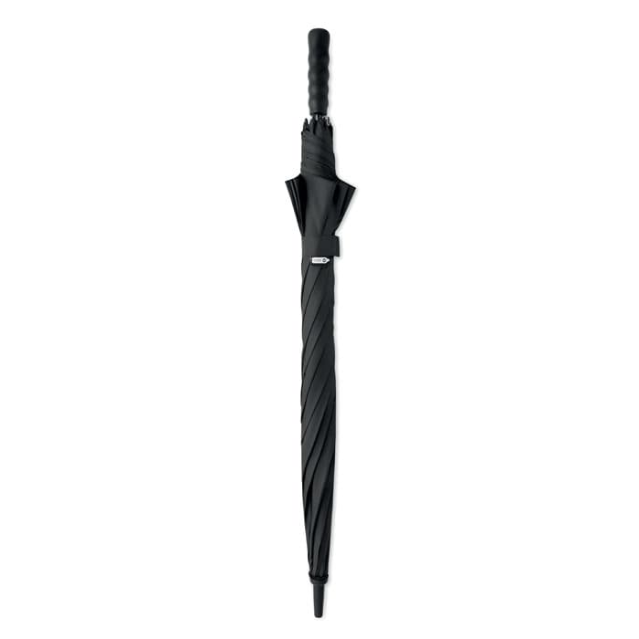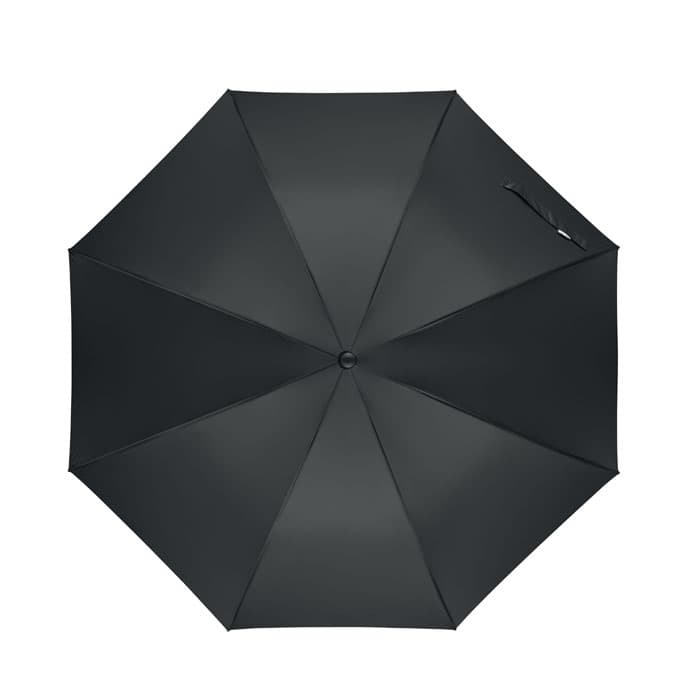 27 inch auto-open windbestendige paraplu in 190T RPET-pongee. Glasvezel schacht en baleinen. Tarwestro en gerecycled ABS handvat. Kunststof uiteinden en top.