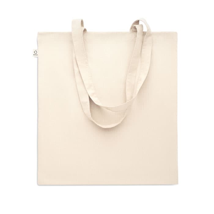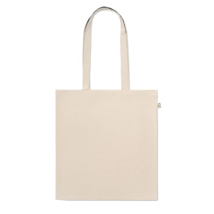 Gerecyclede pre-consumer katoenen boodschappentas (70% gerecycled katoen en 30% RPET) met lange hengsels. 140 gr/m². Dit artikel kan krimpen na het afdrukken.