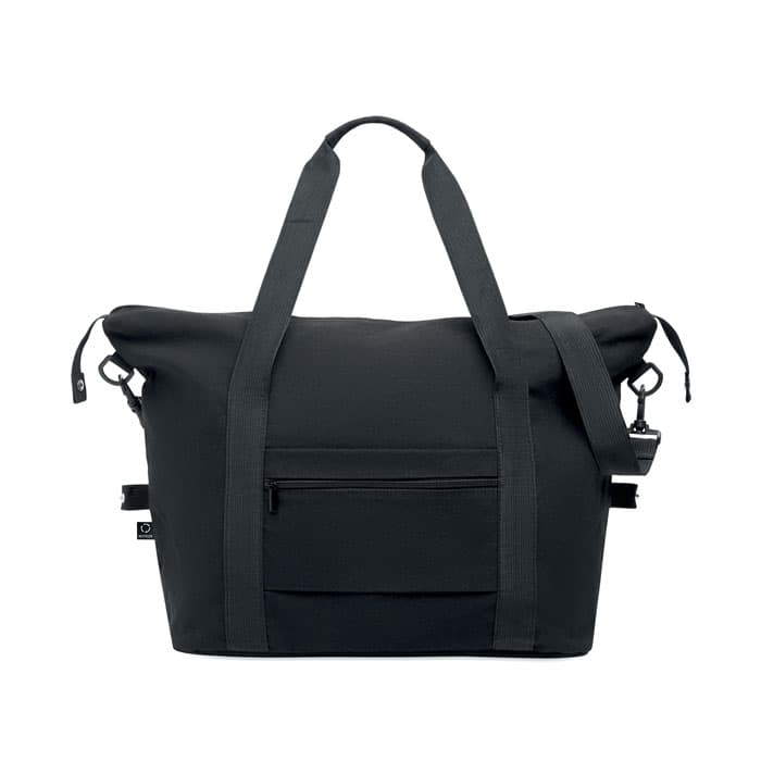 Weekend- reistas van gerecycled pre-consumer katoen en gerecycled polyester (70%/30%) met voering van 210D RPET polyester. De tas heeft een voorvak, achterzak met rits, afneembare en verstelbare schouderriem en gewatteerde bodem. Trolleyhouder aan de achterkant.