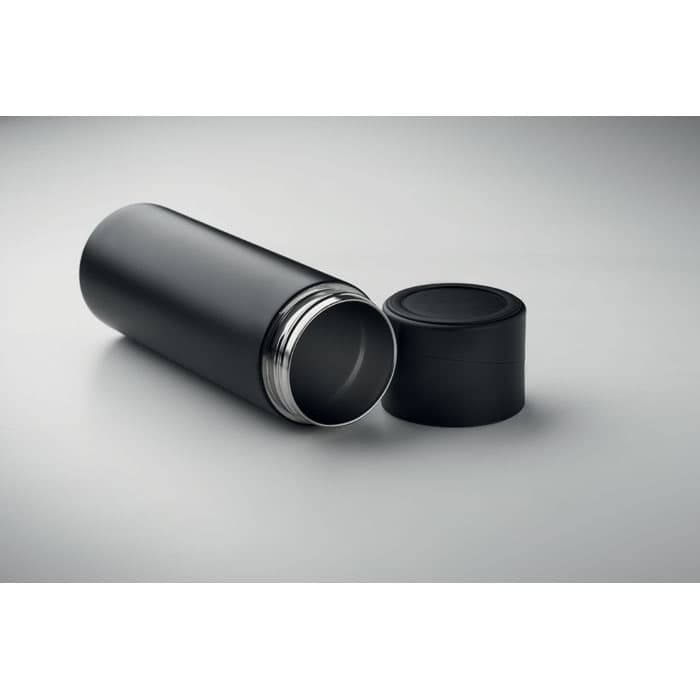 Dubbelwandige vacuüm isolerende fles van gerecycled roestvrij staal (90% gerecycled roestvrij staal en 10% roestvrij staal) met siliconen antislip telefoonhouder dop. Lekvrij. Inhoud: 420ml.