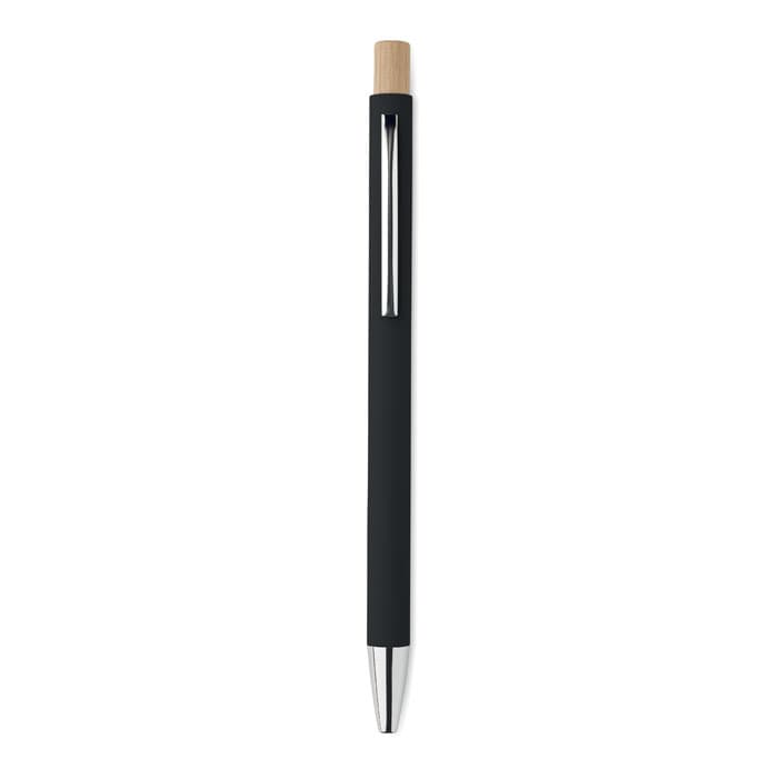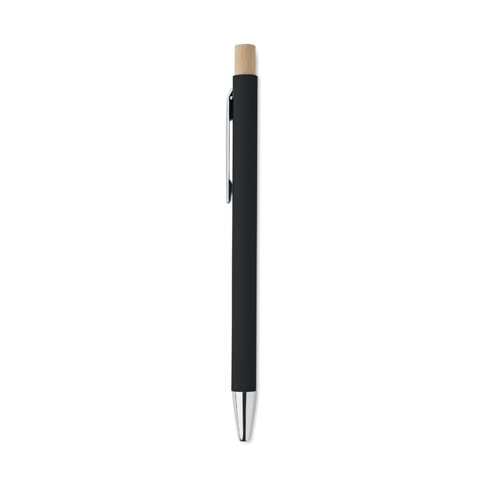 Gerecycled aluminium balpen met bamboe drukknop. Zilveren punt en clip. Blauwe inkt.