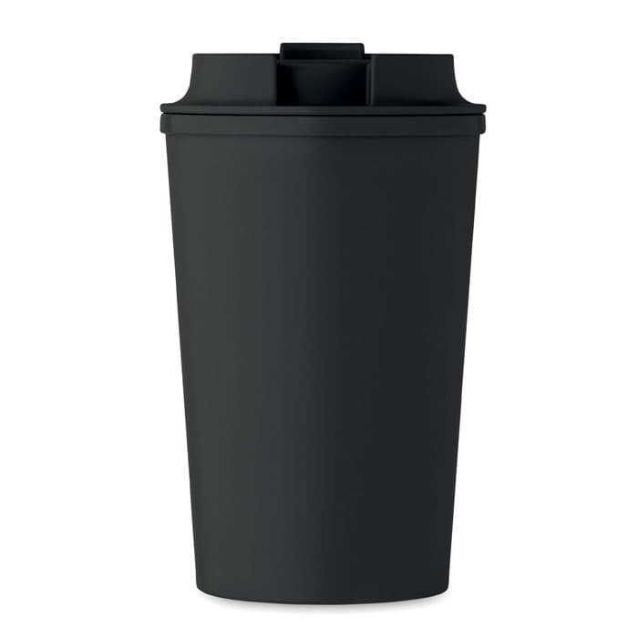 Dubbelwandige beker in PLA maïs met PP drinkdeksel met TPR binnenkant. Inhoud: 350ml.