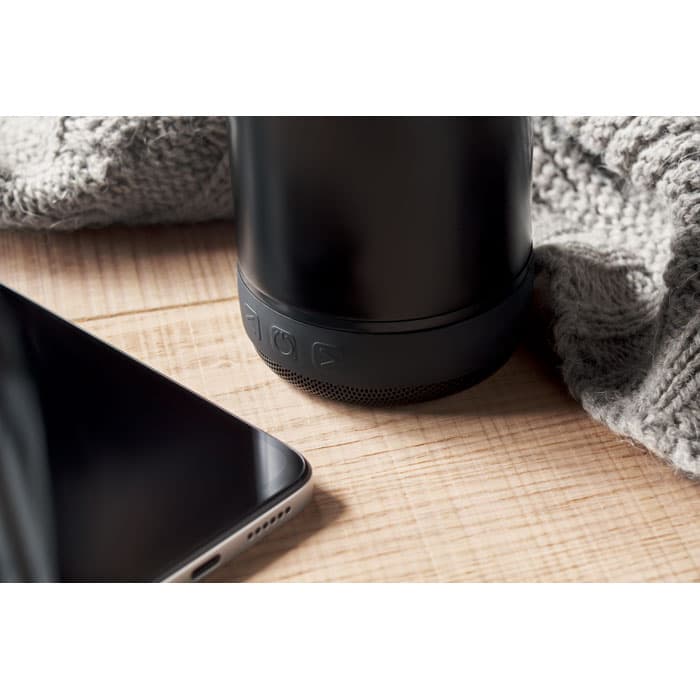 Dubbelwandige vacuüm isolerende fles van gerecycled roestvrij staal (90% gerecycled roestvrij staal en 10% roestvrij staal) en siliconen handvat met afneembare 3W draadloze speaker. Inhoud: 500ml. Batterij van 500 mAh. Verwijder de luidspreker voor reiniging. Lekvrij.
