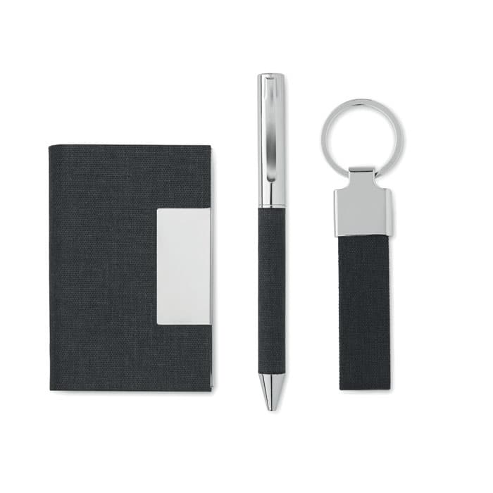 3-delige giftset inclusief metalen balpen met RPET polyester detail, RPET polyester sleutelhanger en RPET polyester kaarthouder met metalen plaatje in geschenkverpakking. Blauwe inkt.