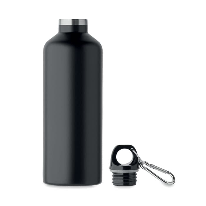 Dubbelwandige vacuüm isolerende fles van gerecycled roestvrij staal (90% gerecycled roestvrij staal en 10% roestvrij staal) met karabijnhaak deksel. De karabijnhaak is niet bestemd voor klimmen (niet voor professioneel gebruik). Lekvrij. Inhoud: 500ml.