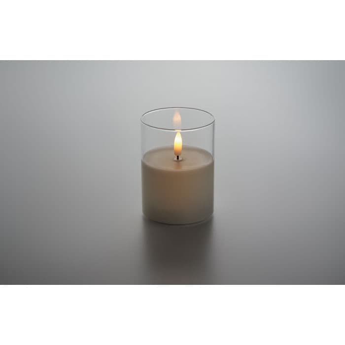 LED waxkaars met echt vlameffect in glazen houder. Werkt met 2 AA-batterijen (niet meegeleverd).