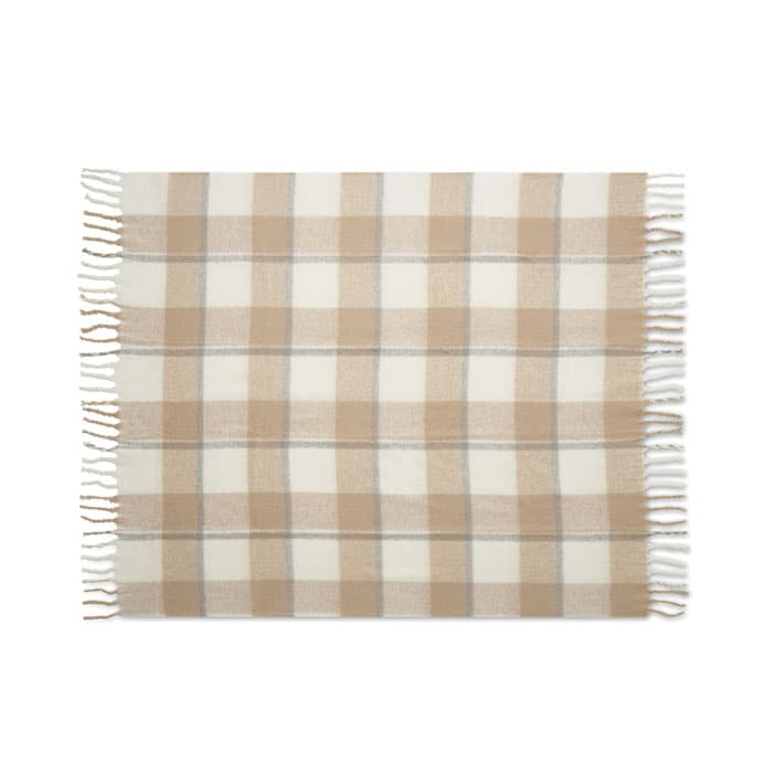 Ruitjesdeken van mohair RPET polyester met handafgewerkte kwastjes. Verpakt in lint en bedrukbare kaart.