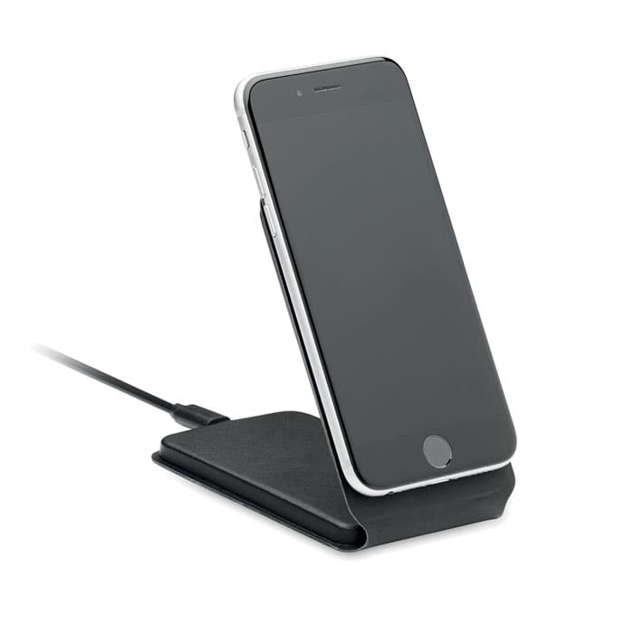 Opvouwbare draadloze oplader 15W met magnetische telefoonhouder van 58% gerecycled polyester en 42% PU.