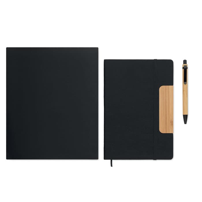 Set van A5 Notitieboekje met harde kaft van RPET met vilt, balpen met bamboe dop en functionaliteit als telefoonstandaard. Ingebonden. 160 gelinieerde pagina's van gerecycled papier (80 vellen). Elastische sluitingsband. Bladwijzer met lint. Blauwe inkt.