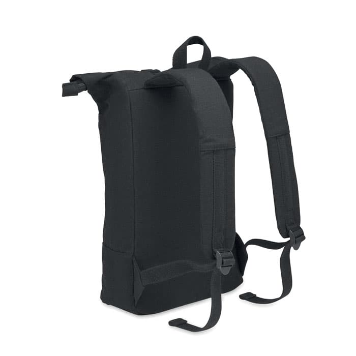 Rolltop 15 inch laptoprugzak met rits van gerecycled pre-consumer katoen en gerecycled polyester (70%/30%). Voorvak met rits. Gewatteerde rug- en schouderbanden. 340gr/m².