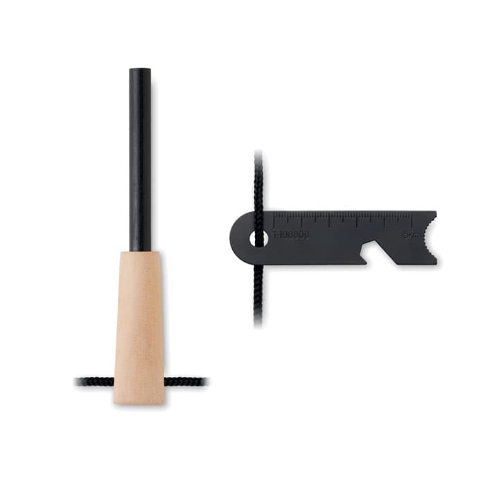 Vuurstartergereedschap van dennenhout en roestvrij staal, inclusief een aanmaakstokje, een multifunctionele schraper voor gebruik met je vuurstarter, flesopener, precisieliniaal en inbussleutel.