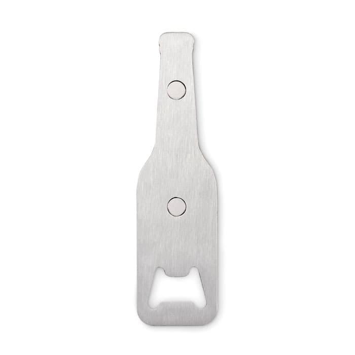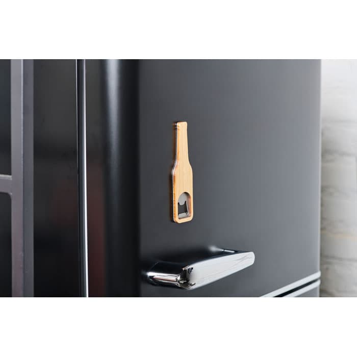Magnetische flesopener van roestvrij staal met bamboe oppervlak.
