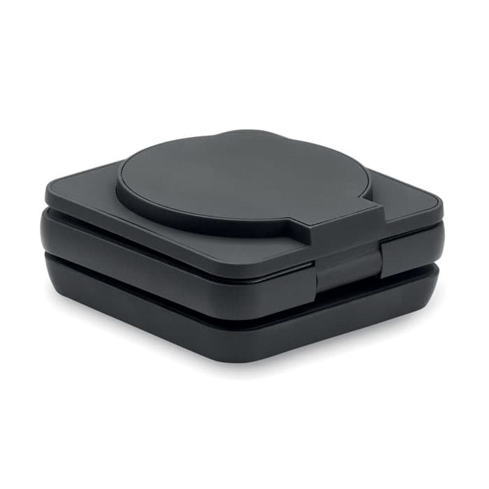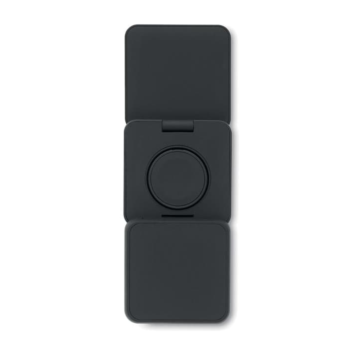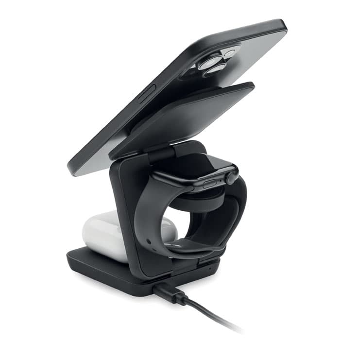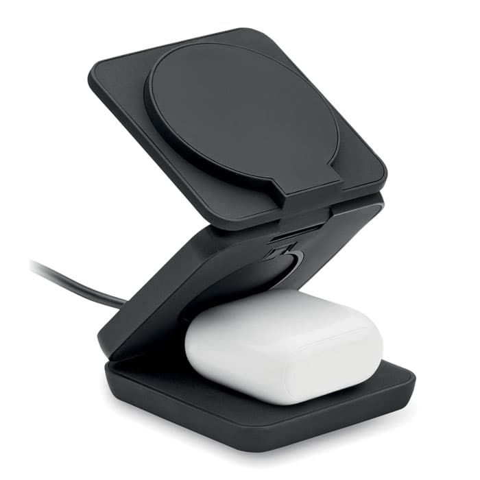 3-in-1 opvouwbaar oplaadstation van gerecycled ABS met rubber. Het omvat een magnetische draadloze oplader van 15W, een smartwatch-oplader (alleen Apple®) en een TWS-oplader.