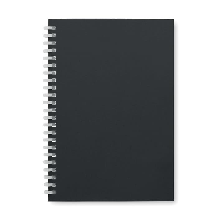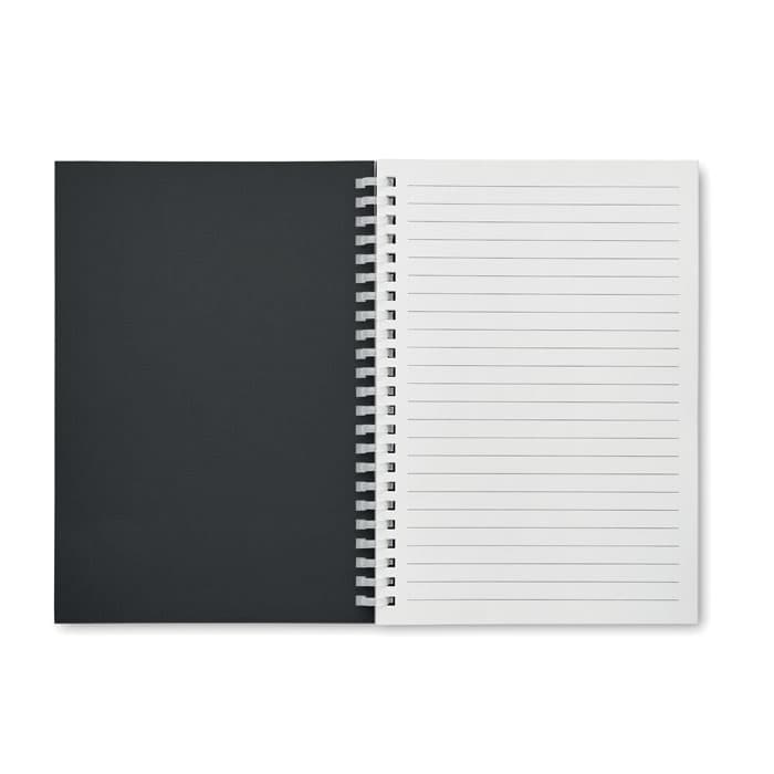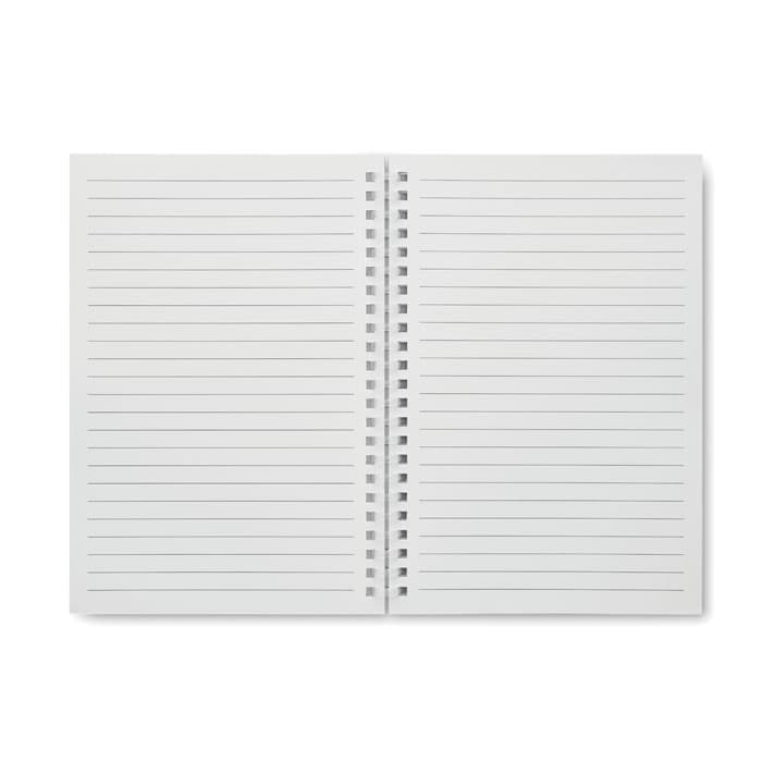 A5 notitieboek met gerecyclede kartonnen kaft en zachte ringband. 160 pagina's met gerecycled gelinieerd papier (80 vellen). FSC®-certified | FSC MIX CREDIT, P7.1, FSC-C213206