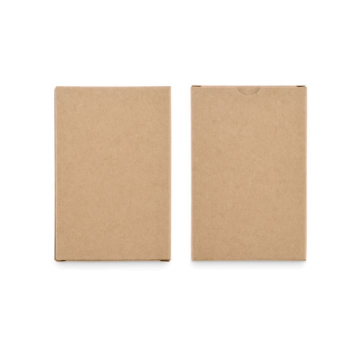 Houten dominospel en speelkaarten van gerecycled papier in kartonnen doosje. Geleverd in MDF doos.