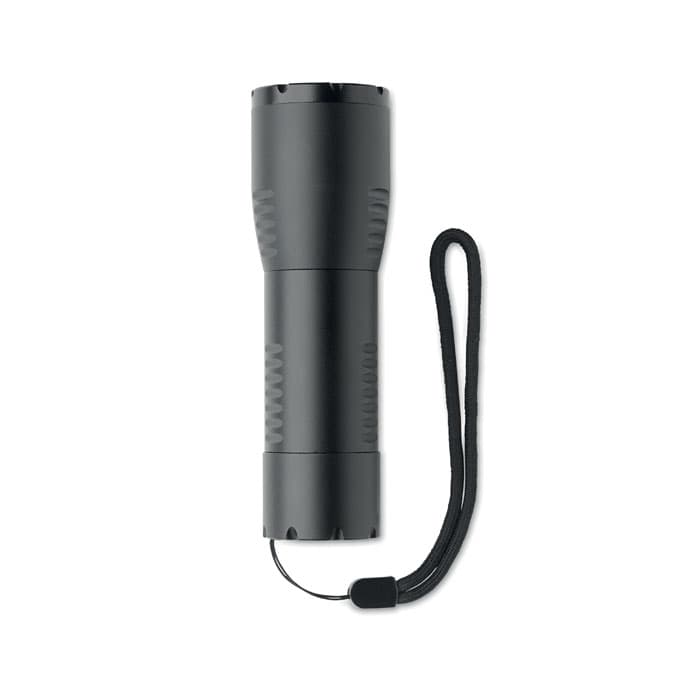 Kleine aluminium zoombare LED zaklamp en afneembare riem. Vermogen: 200 lumen. Exclusief 3 AA-batterijen.